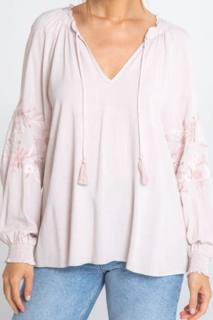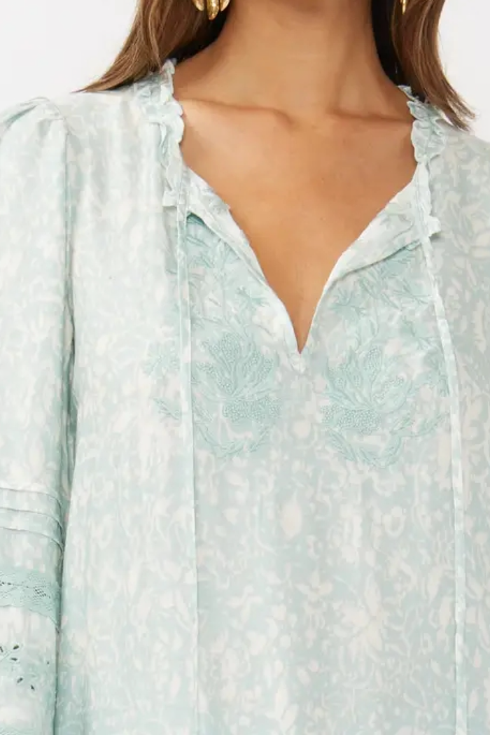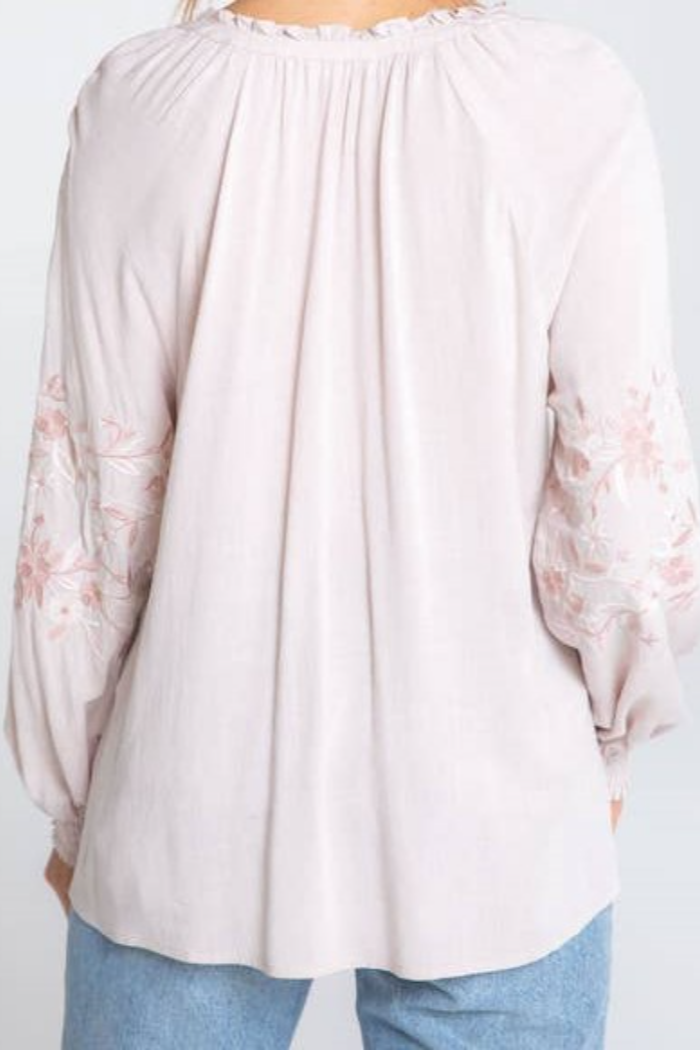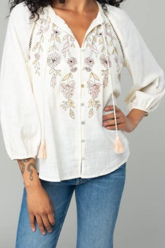 Floral Embroidered Lace-Trim Split Neck Blouse