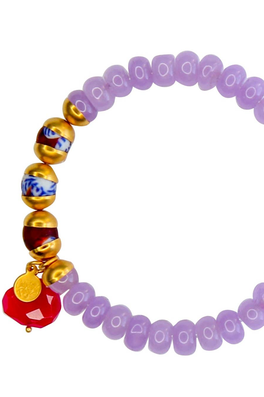 A stunning combination of bold lavender beads add multi-colored African accents create a cheerful, eye-catching design. Finished with a gemstone and gold detailing, this bracelet captures the spirit of fun and individuality. Perfect for stacking or wearing on its own, it brings a lighthearted touch to your daily look. Stretch fit for ease, designed for everyday wear.