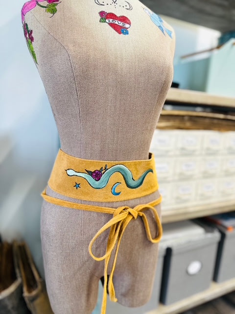 One size suede wrap belt is hand-painted and ready to complete any top, dress, skirt, or jeans,