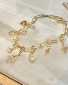 Gold plated paperclip chain bracelet with 7 clicker bail charms.