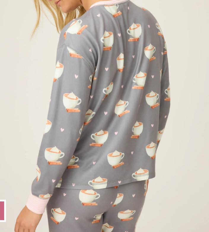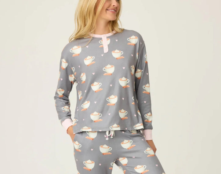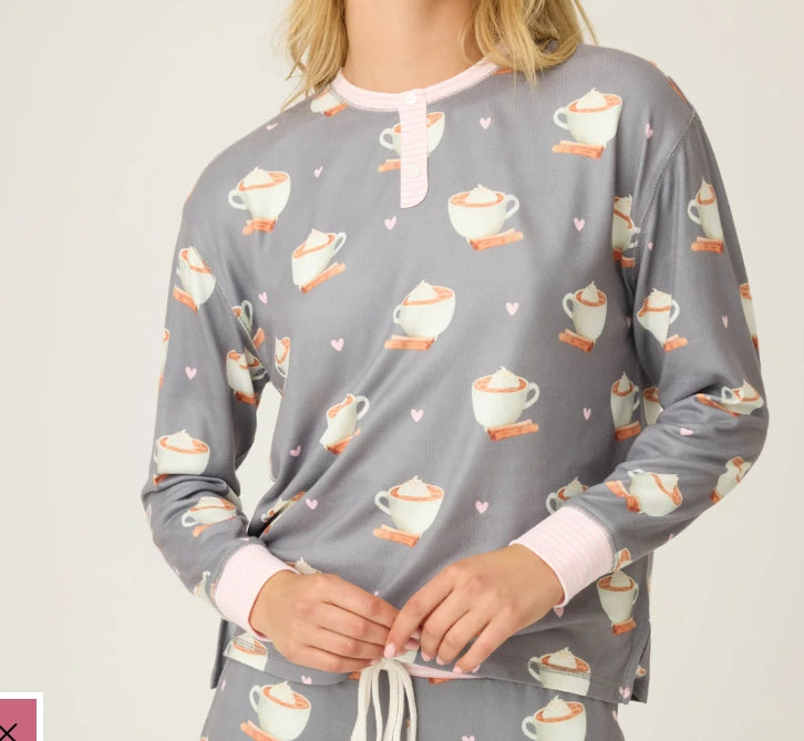 A little cinnamon, a little cream, and a whole lot of cozy. This dreamy butter jersey long sleeve top is sprinkled with latte cups, pink hearts, and swirls of whipped topping—like your favorite morning pick-me-up in lounge form. Finished with a candy-pink striped collar, faux button placket, and cuffs, it’s sweet from top to bottom.