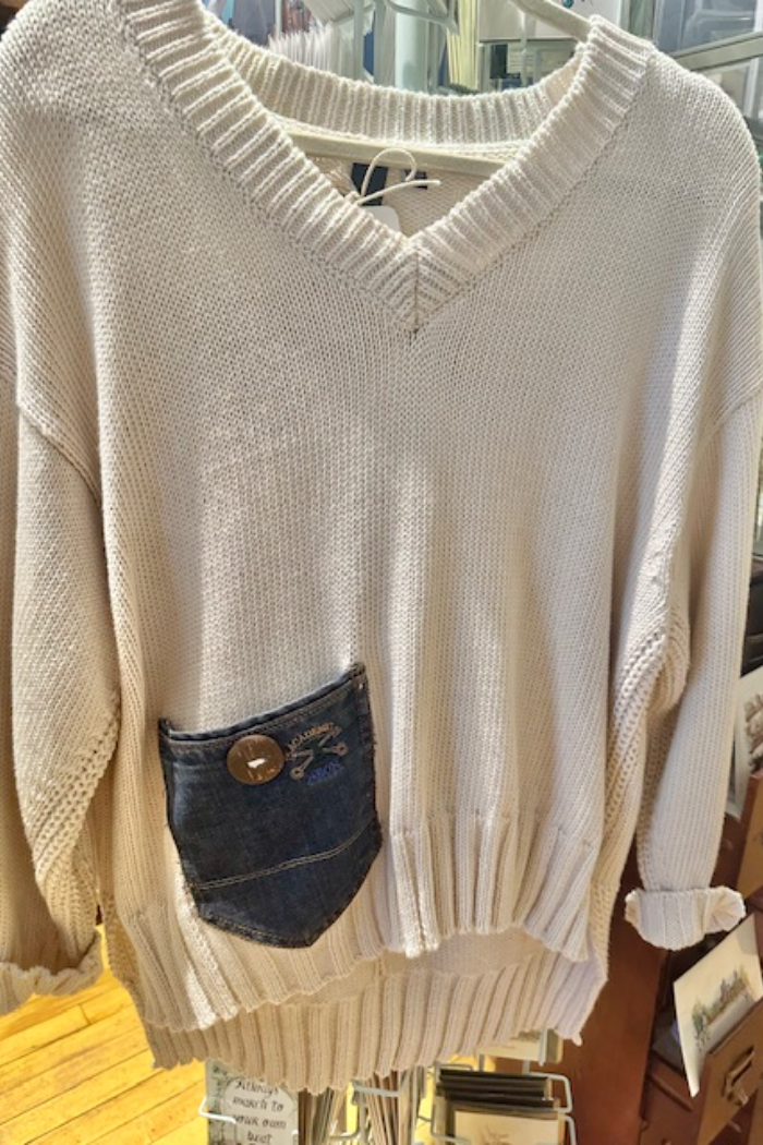 One of a Kind oversized Pullover Sweater. Cotton Knit with upcycled denim details and a band tee.