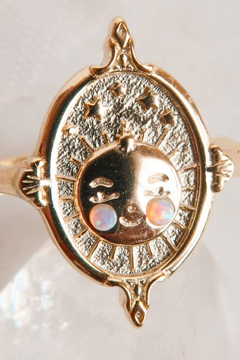 * 14k Gold Plated Sterling Silver Blushing Opal Moon Face in a Frame Ring