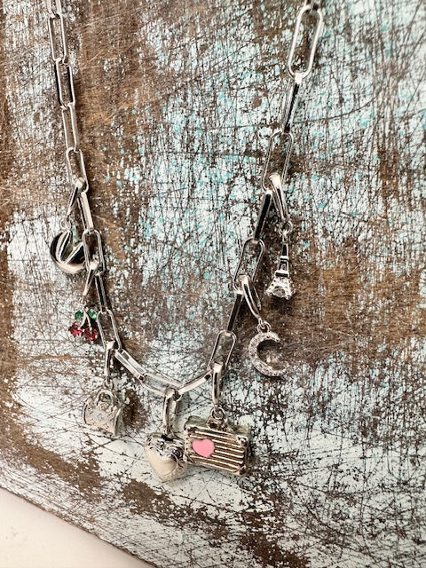 Rhodium plated necklace and charms.