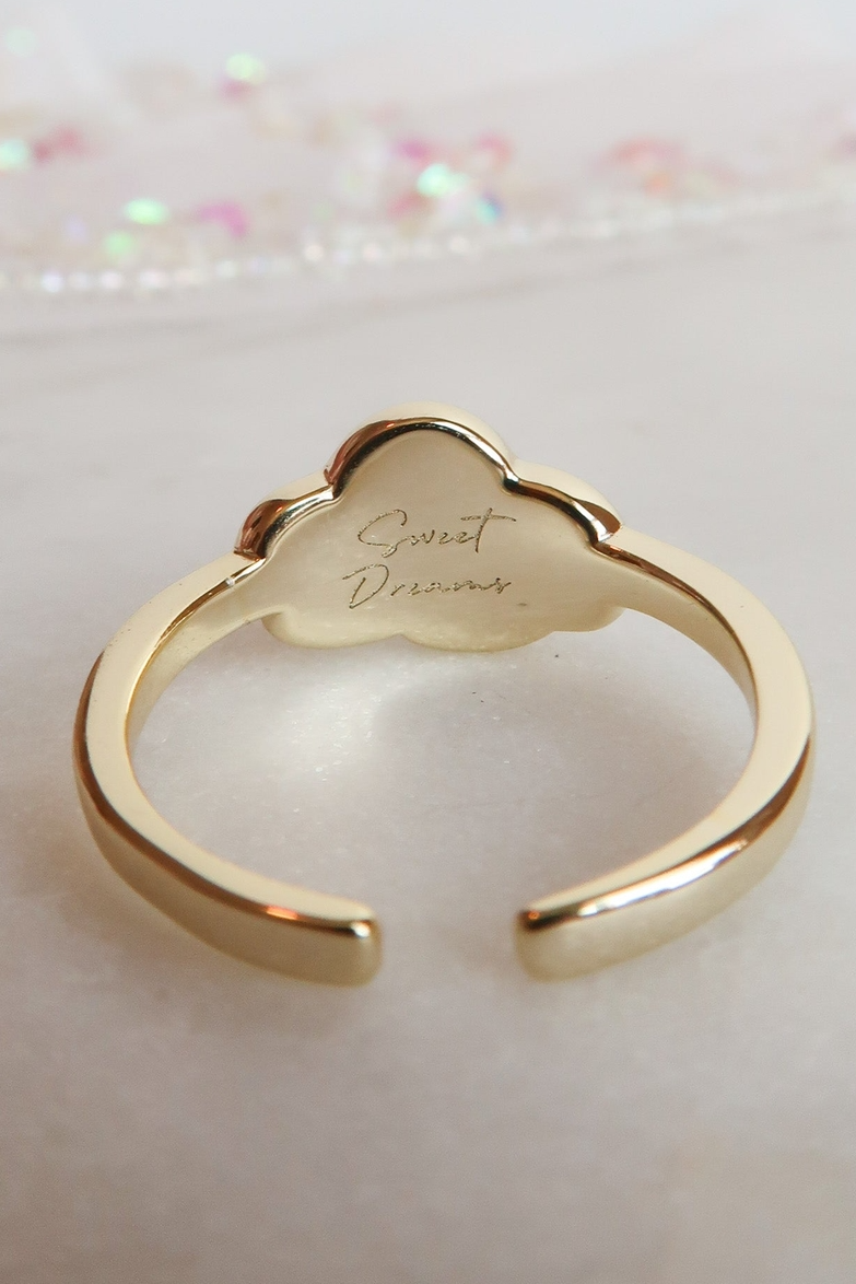 The Sweet Dreams Ring is a tender reminder of comfort, hope, and the beauty of drifting into dreamland. Crafted in 14k gold-plated sterling silver, this ring features a blushing opal cloud with the words “sweet dreams” engraved on the back as a hidden message to the wearer. The glowing opal captures shifting colors like the ever-changing sky, while the cloud symbolizes serenity, imagination, and rest. Designed to feel like a bedtime wish carried close to your heart, this opal cloud ring is perfect as a thoughtful gift, a daily keepsake, or a personal reminder to find peace in every season of life.