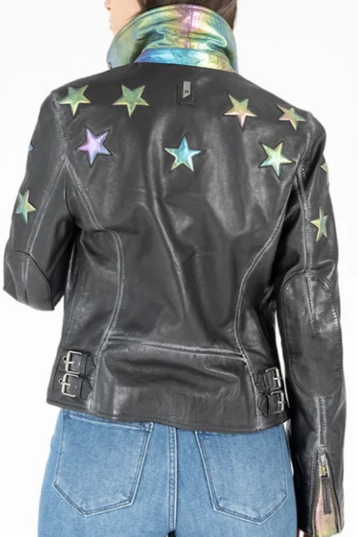 The Candy Jacket adds a bold, playful twist to a classic moto design. Black Rainbow features foil-printed holographic rainbow stars that shimmer in the light, it’s finished with a matching collar and gussets for a striking, cohesive look. Off White/Floral is adorned with digitally printed floral stars that evoke the spirit of spring.