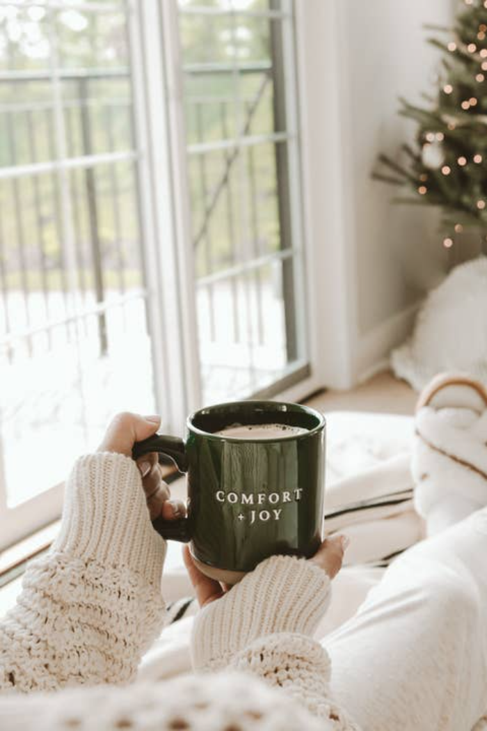 Add a pop of green to your shop! Our Comfort and Joy holiday mug features a stunning shade of green with white lettering that pops.