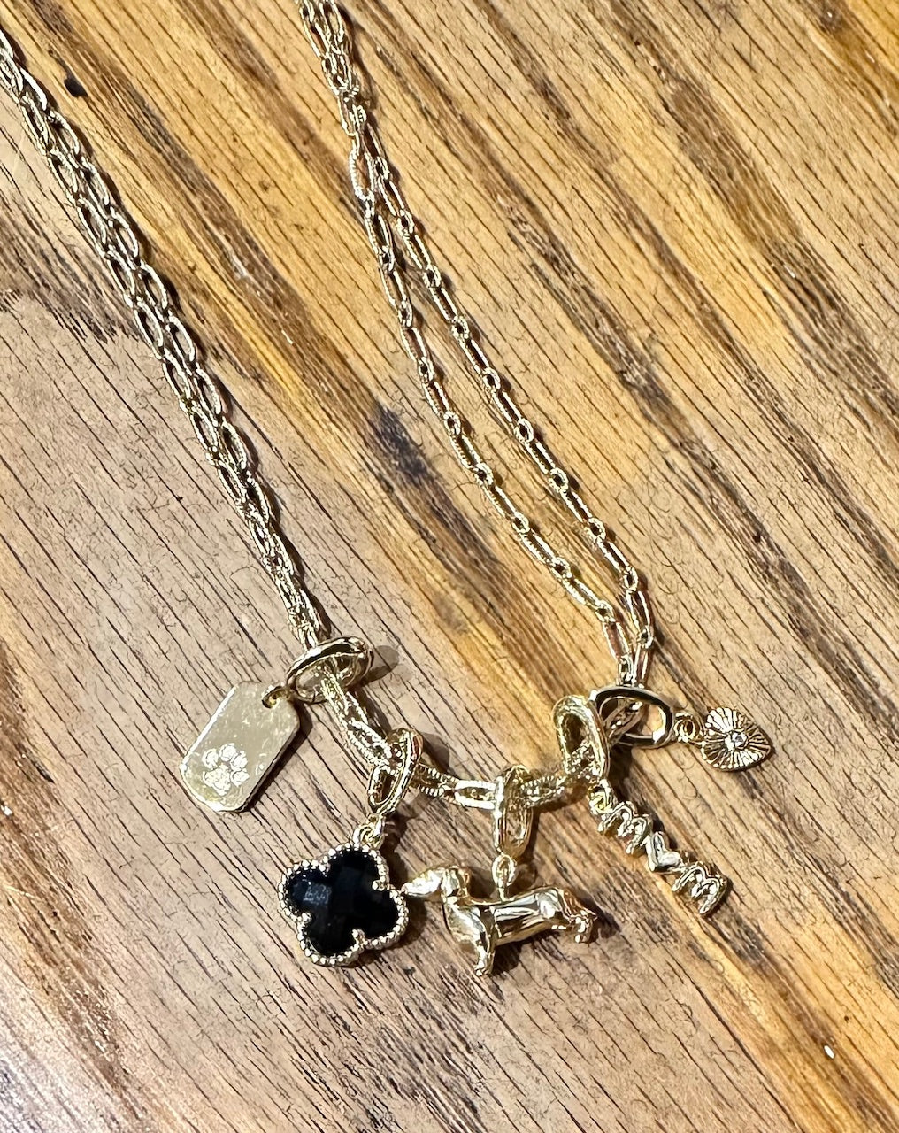 5 gold plated charms with clicker bails. Charms can be easily moved around and changed up to suit your style. you can put charms on other necklaces or bracelets too!