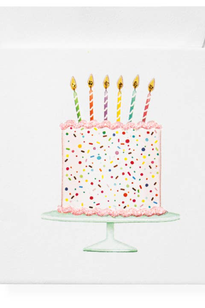 Send kindness with this perfectly adorable hand-glittered card featuring a cake.