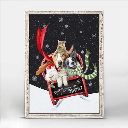 Put a smile on your face with Cathy Walters' merry pup painting featuring a pack of dogs having winter fun and sledding with joy. Miniature versions of our signature canvas wall art are each framed with a rustic wood finish. Our mini art pieces are a delight for interior decorators to set on a shelf or ready to hang on the wall. These can be collected individually, or in a curated series to create a custom gallery wall.
