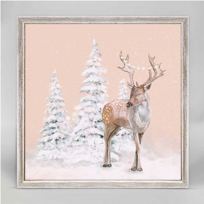 Cathy Walters' painting features a spotted stag in a blush pink and white winter forest in this classic and simple illustration. Miniature versions of our signature canvas wall art are each framed with a rustic wood finish. Our mini art pieces are a delight for interior decorators to set on a shelf or ready to hang on the wall. These can be collected individually, or in a curated series to create a custom gallery wall.