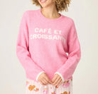 Women’s bright pink crewneck sweater with “Café Et Croissants” text graphic in boucle embroidery.