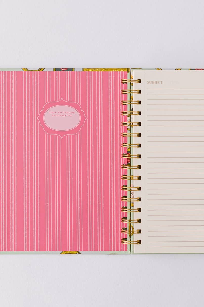 Notebook measures 8.75" x 6.25" and is bound with gold double-O wire binding. Includes 200 lined pages. Front and back covers feature full color illustration.