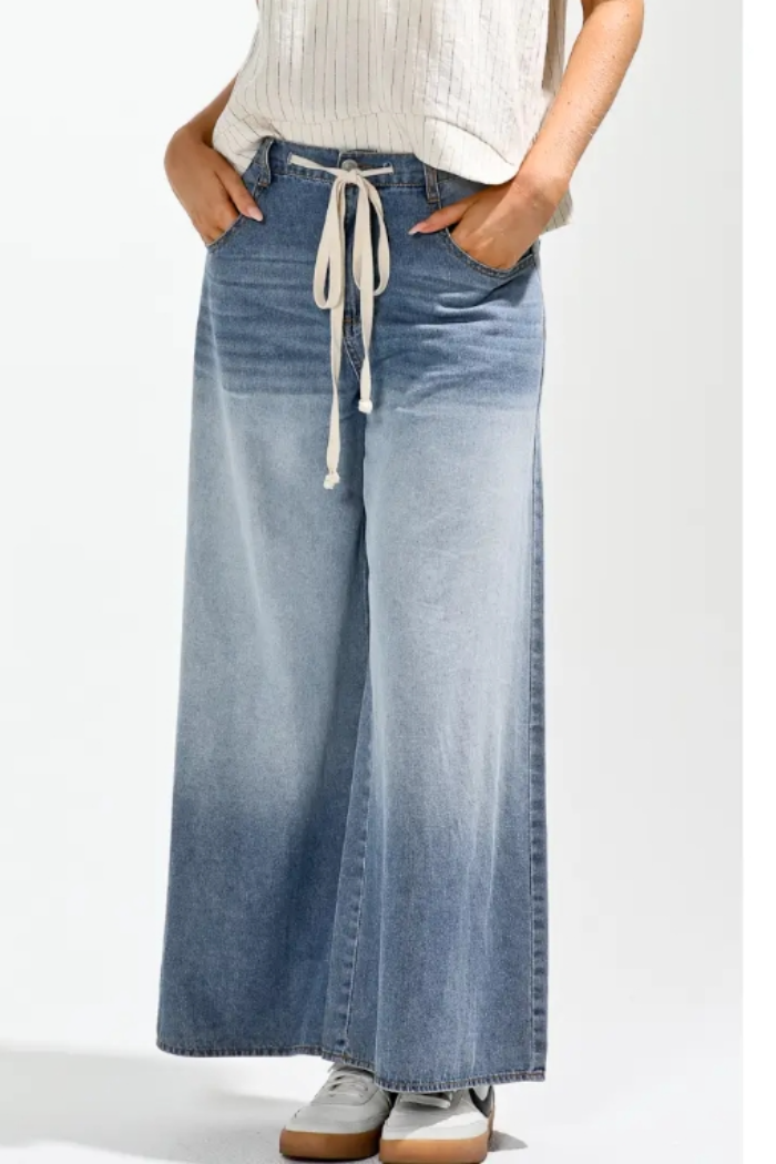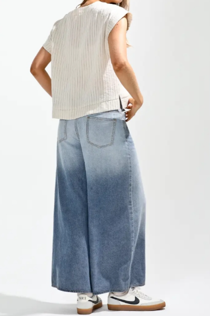 Ombre Dyed Wide Denim Pants are airy wide-leg jeans finished with a soft ombré wash that fades from light to medium indigo. These NoaBoa pants feature a high-rise waist and a cropped, culotte-length silhouette that skims the ankle. Crafted from denim with classic back pockets and a clean hem, they pair easily with casual tees and sneakers for relaxed weekend styling. The ombré dye gives a modern, retro-inspired touch to an everyday denim staple.