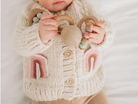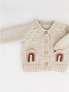Thick, soft sweater with Mauve rainbow pockets has cable trim, raglan sleeves and wood buttons. Hand-knit in natural hued Icelandic yarn, it is cozy and warm. The Mauve Rainbow matching knit hat you see here is available separately. What a wonderful gift for any little person you know.