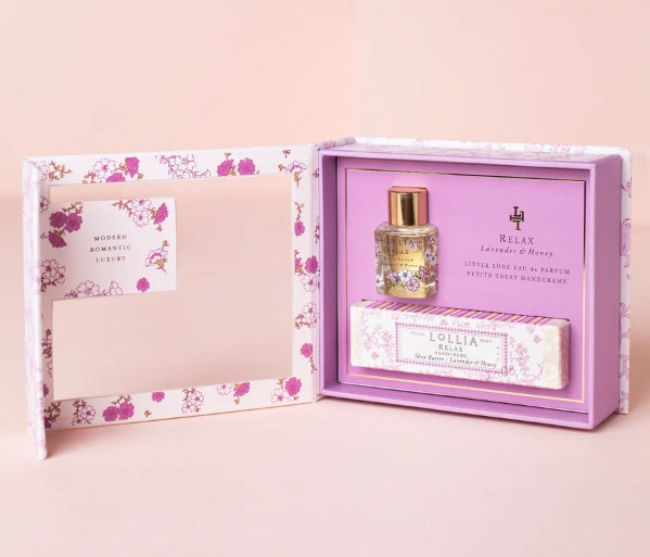 Delve into a captivating fragrance story. This chic petite pairing of Eau de Parfum and Shea Butter Handcreme is the perfect introduction to the dreamy Relax fragrance, for yourself or as a gift. A decadent duo, enjoy silky-smooth, delightfully-scented skin. A sublime set for on-the-go luxury.