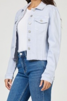 Fitted, cropped denim jacket with puffed sleeves & frayed hem
