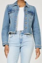 Fitted, cropped denim jacket with puffed sleeves & frayed hem