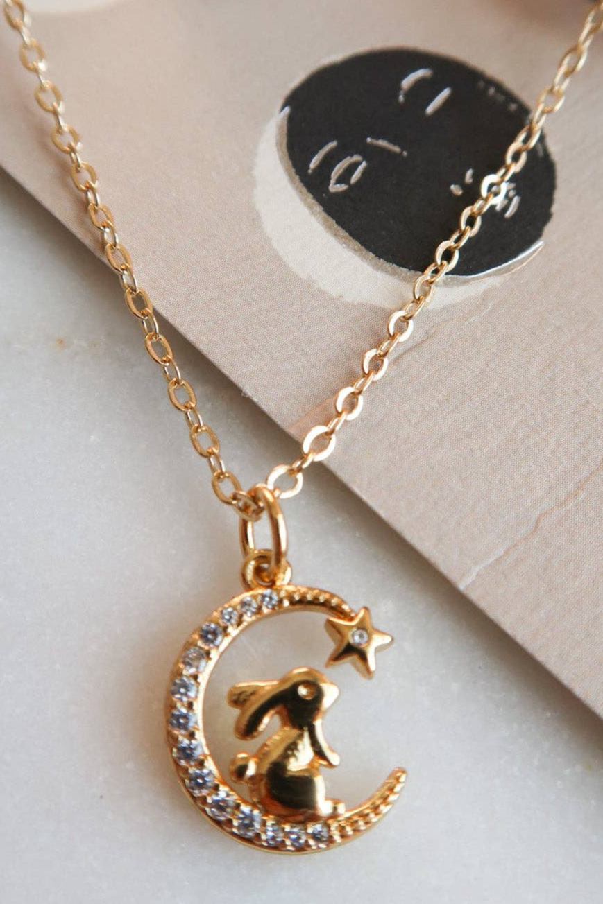 The Runaway Bunny Necklace is a dreamy tribute to adventure, nostalgia, and the magic of childhood stories. Featuring a delicate bunny perched on a crescent moon, this celestial necklace captures the feeling of chasing dreams, wandering through starlit nights, and believing in the impossible. Inspired by the timeless tale of unconditional love and endless journeys, this piece is perfect for free spirits, daydreamers, and those who find comfort in the night sky. A reminder that no matter how far you roam, some hearts will always find their way back home.