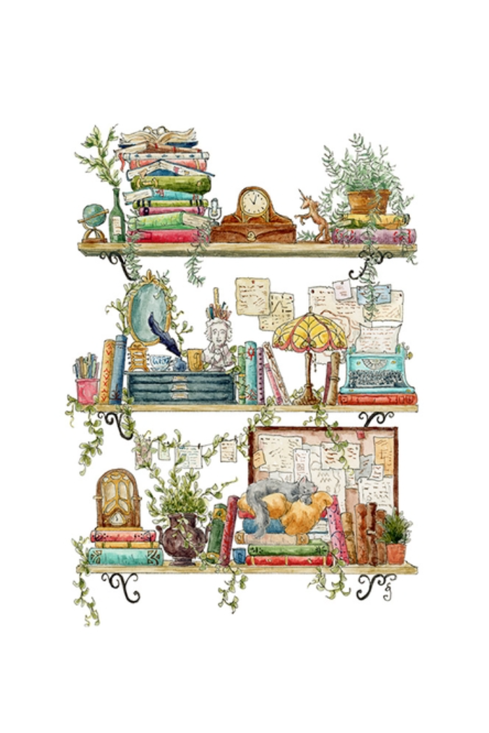 Giclée print featuring my original watercolor and ink illustration of the oddities, books, and tools tucked away in the shelves of a vintage writer, including a Poe pencil holder, a stained glass lamp, and a blue typewriter.