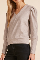 cozy heather knit, this pullover features puff sleeves and a v-neck. An ideal transitional piece for cooling temperatures, it strikes the balance between comfort and style.