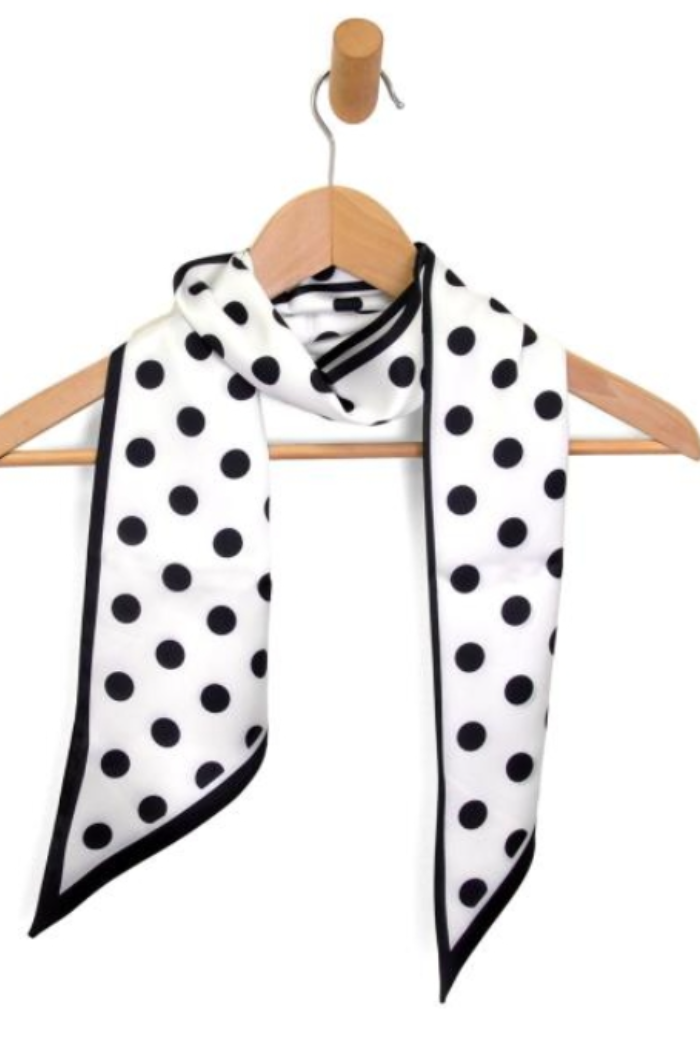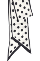 The White & Black Polka Dot Double Sided Scarf is a lightweight, rectangular silk-like scarf printed with bold black polka dots on a white ground and finished with narrow black piping. This versatile neck scarf from Joy Susan can be worn tied at the throat, draped over shoulders, or looped through a bag strap for a chic accent. Its double-sided print and smooth finish make it an easy, polished finishing touch for both casual and dressy outfits.