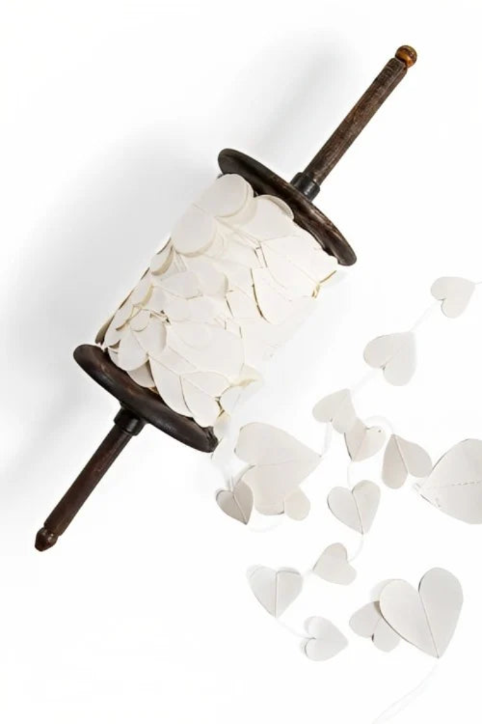 This darling paper heart garland comes in a white color. This garland is 27 yards and comes with a wooden spool. Our heart garland is not only perfect for your home or wrapping gifts but also as a gift!