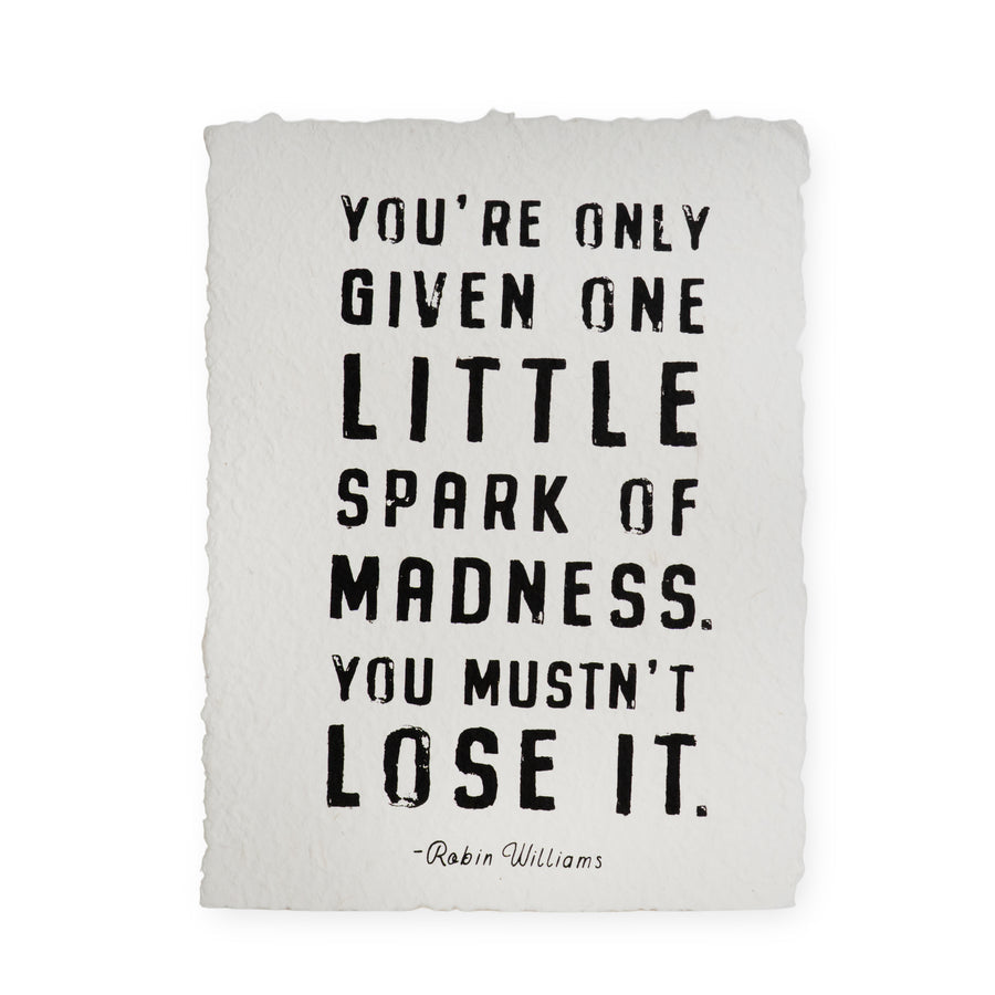 A reminder from one of our favorite souls, Robin Williams — “You’re only given one little spark of madness. You mustn’t lose it.” Our You’re Only Given Handmade Paper Print celebrates the magic of individuality and the courage to let your light shine bright.